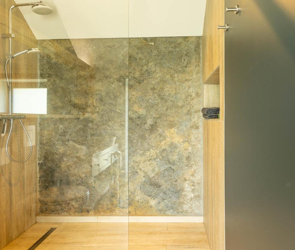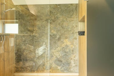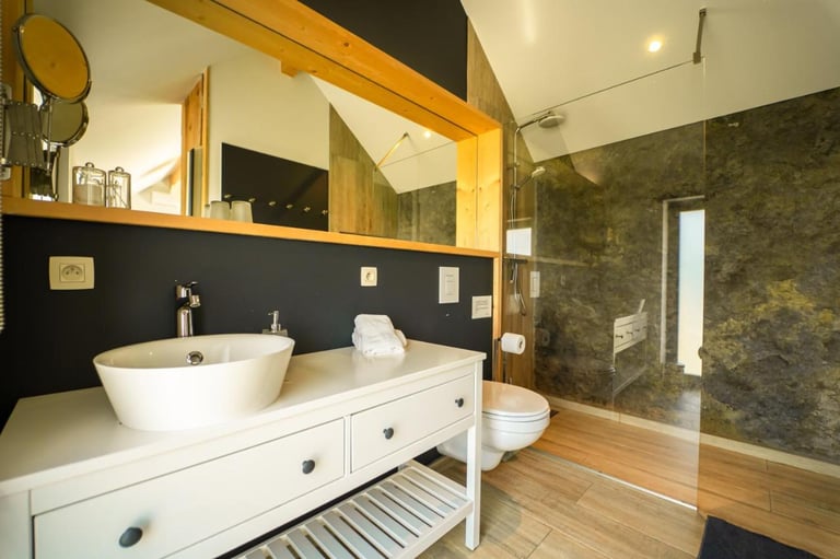 L'étage de cet espace est conçu pour offrir une nuit inoubliable. Avec un lit king size entouré d'une tête de lit sur mesure, votre confort est assuré. La salle de douche dispose de tout le nécessaire pour vous rafraîchir, que ce soit avant de plonger dans les bras de Morphée ou après. Pour couronner le tout, une magnifique terrasse se trouve au pied de votre lit, vous invitant à profiter d'un moment de tranquillité tout en admirant la vue.